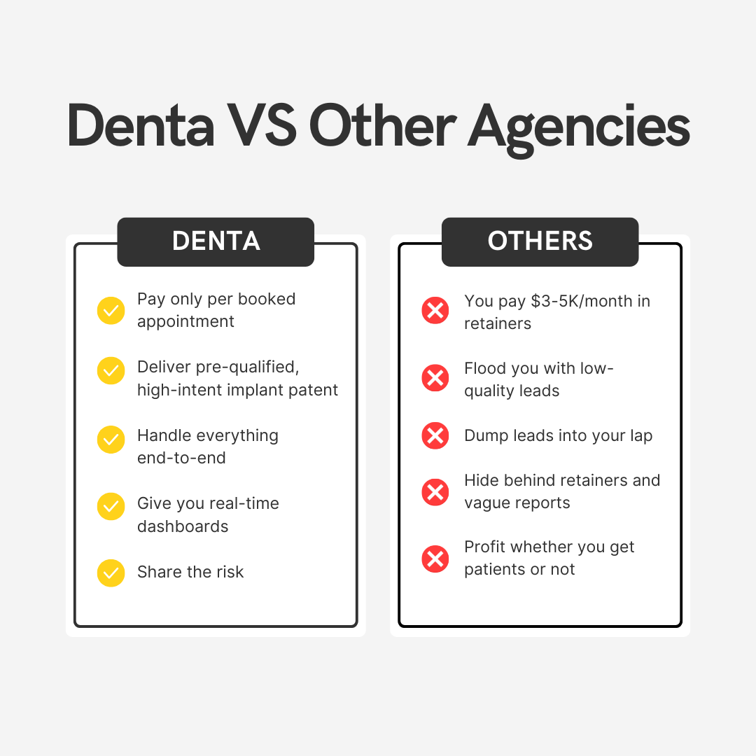 Traditional agencies use cookie-cutter solutions and book low-quality tire-kickers, wasting your time with patients who'll never convert. Denta flips that model.